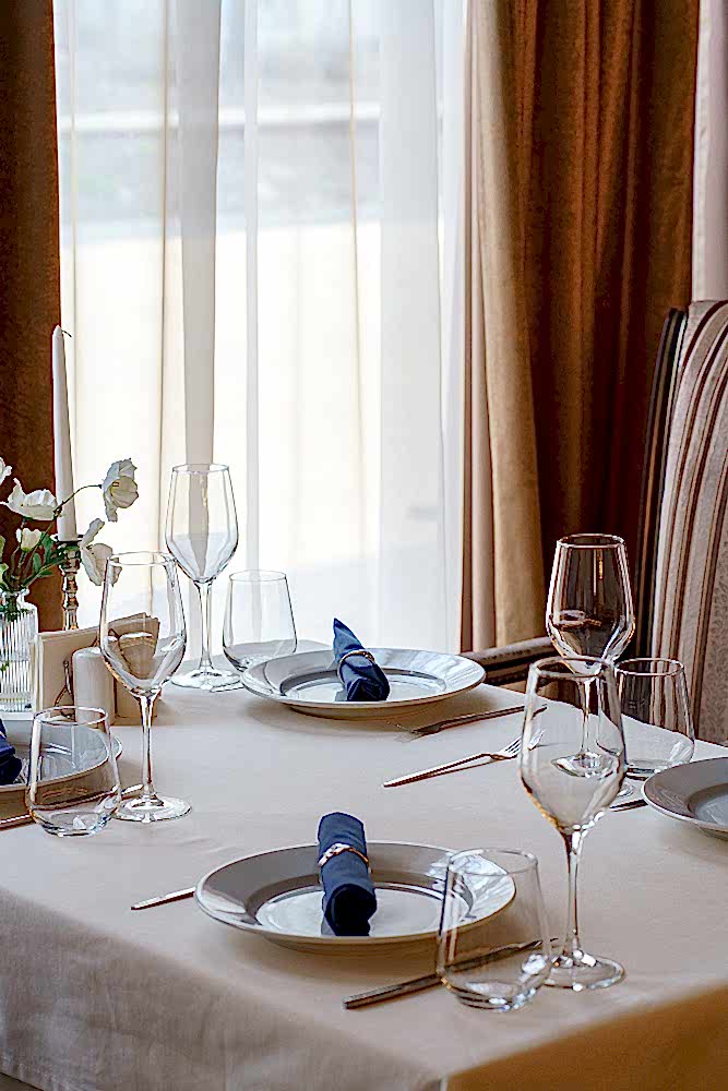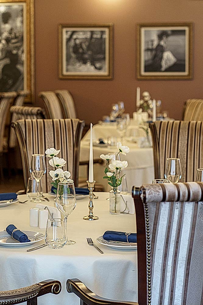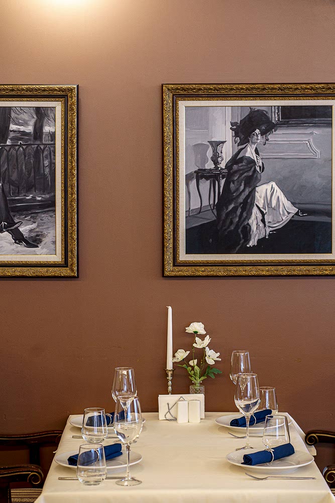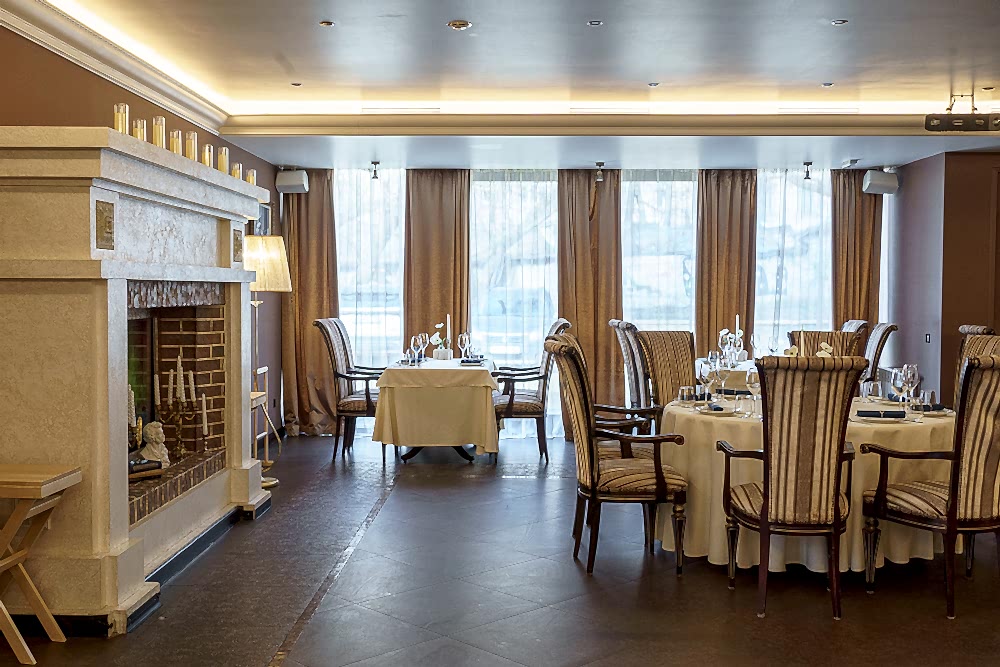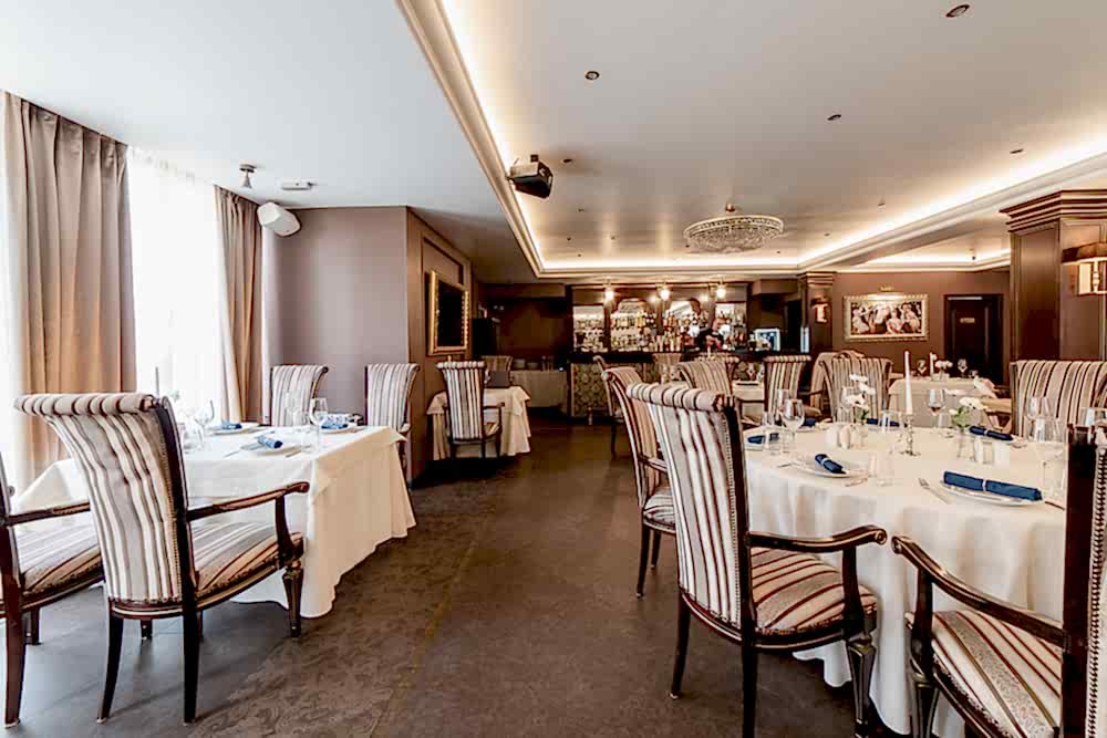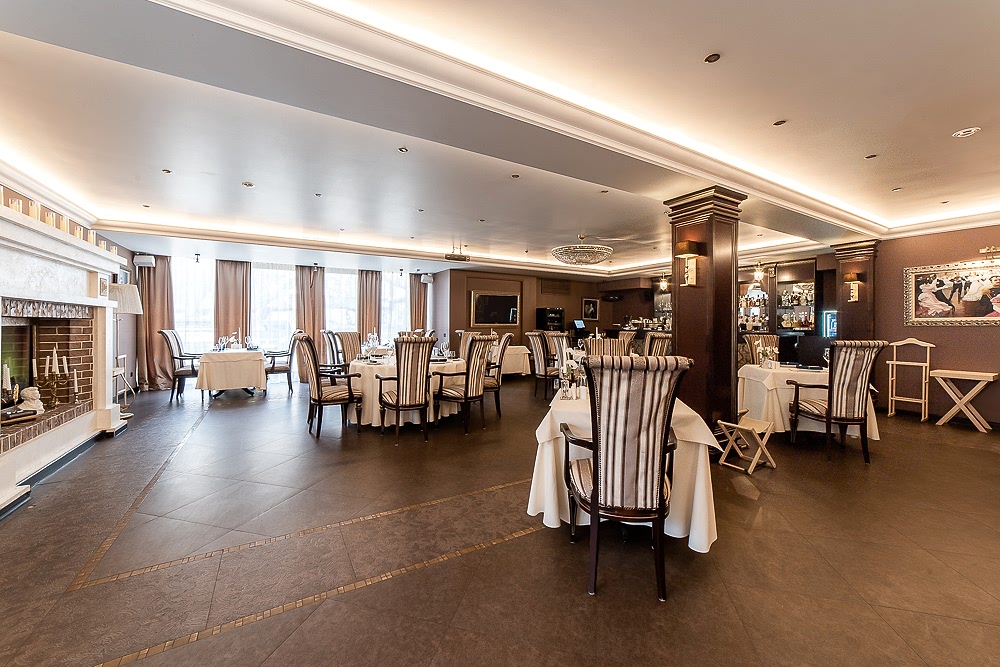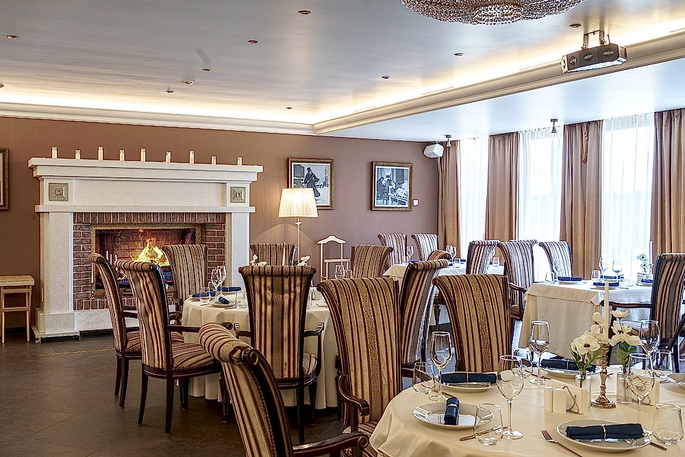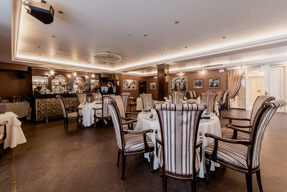 Посадка продумана для любого Pin-Up у окон - камерные столы на двоих, в центре - круглыe для дружеских и деловых встреч. Удобные кресла с высокой спинкой и полосатой обивкой поддерживают общий стиль и дарят комфорт на протяжении всего вечера.