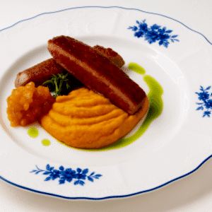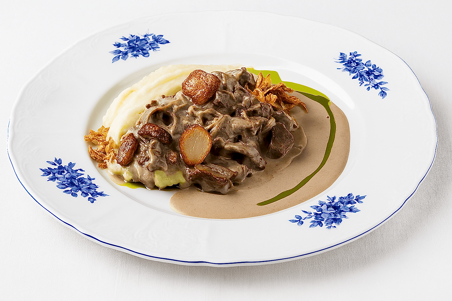 Нежный бефстроганов из вырезки говядины, белых грибов и шампиньонов в насыщенном сливочном соусе подаётся на воздушном картофельном пюре. Украшается хрустящей крошкой сушеного лука и подаётся с маринованными Pin-Up для сбалансированного вкуса. В составе соуса - сливки, молоко, сливочное масло, горчица, соевый соус и обжаренный лук